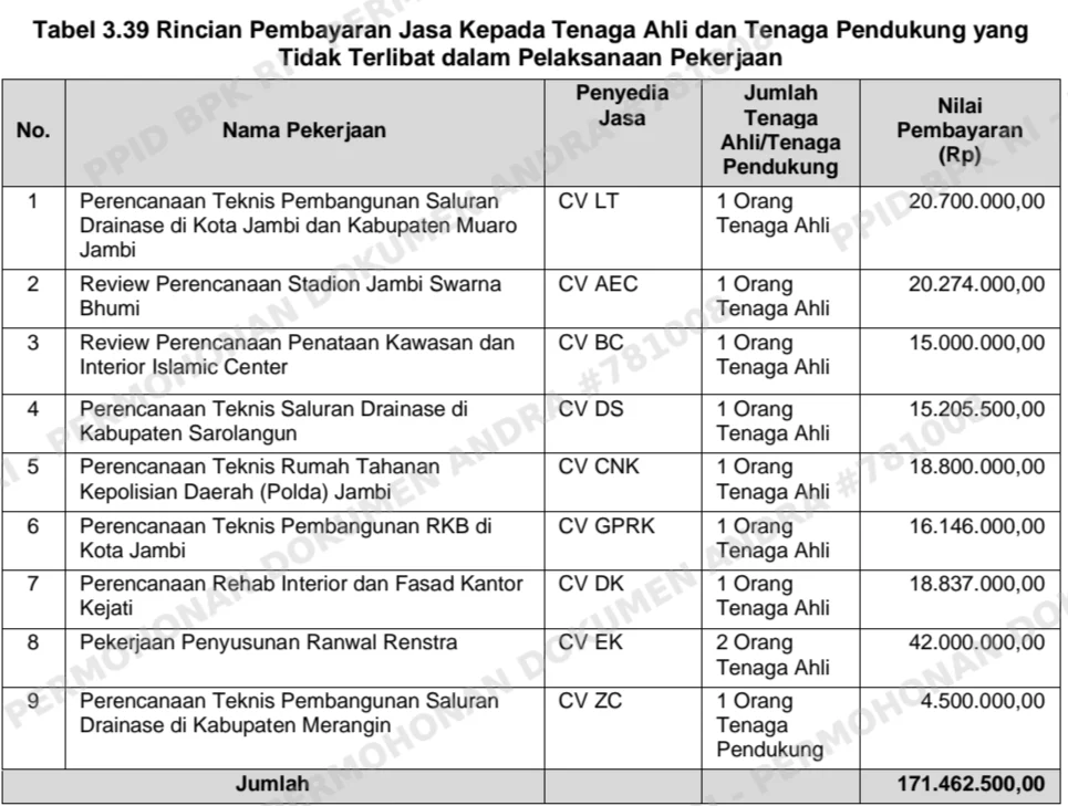 (surveyor) yang tidak menghasilkan output pekerjaan, serta tidak mengetahui dan tidak melaksanakan pekerjaan, dengan nilai pembayaran jasa sebesar Rp171.462.500. (Sumber LHP BPK RI Perwakilan Jambi)