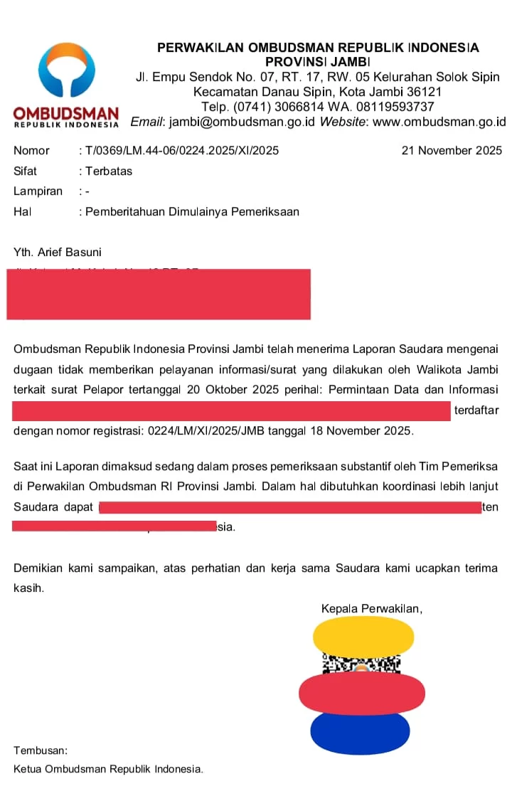 Dalam surat tertanggal 21 November yang dikirim pada 24 November 2025 dengan nomor T/0369/LM-44-06/0244.2025/XI/2025, diinformasikan bahwa Ombudsman Jambi sedang dalam proses pemeriksaan substantif.