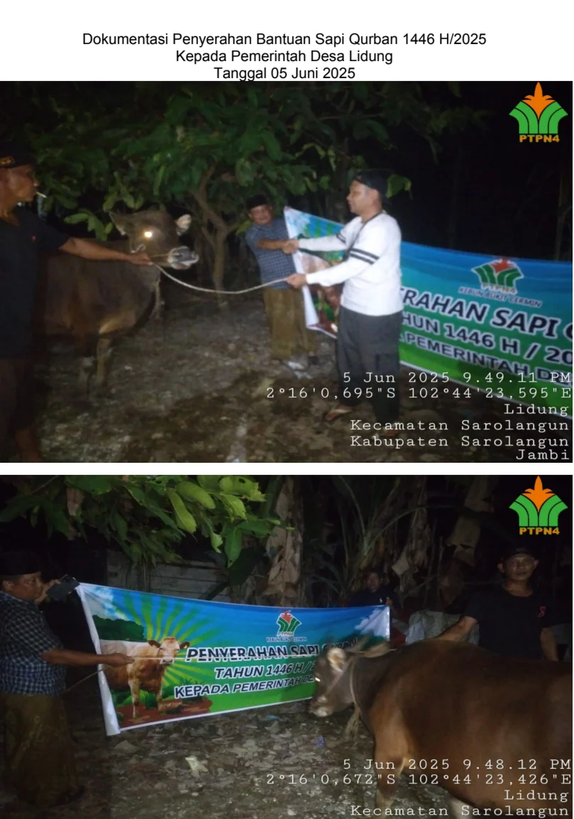 Penyerahan Hewan Kurban tersebut di Laksanakan pada Malam Lebaran Haji, Hewan Kurban tersebut di serahkan oleh Humas PTPN IV region lV Kebun Bukit Cermin A. Jalil, Bantuan Sapi Kurban tersebut di Terima Langsung Oleh Perangkat Desa Lidung Kecamatan Sarolangun.